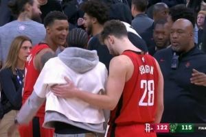 老队友了!小贾巴里和申京赛后和小凯文·波特寒暄叙旧